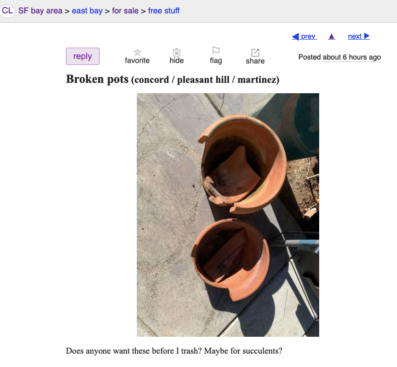 CL east TX free stuff. SF bay area free stuff post. 4East SF Bay Area Freecycle Trash Nothing.